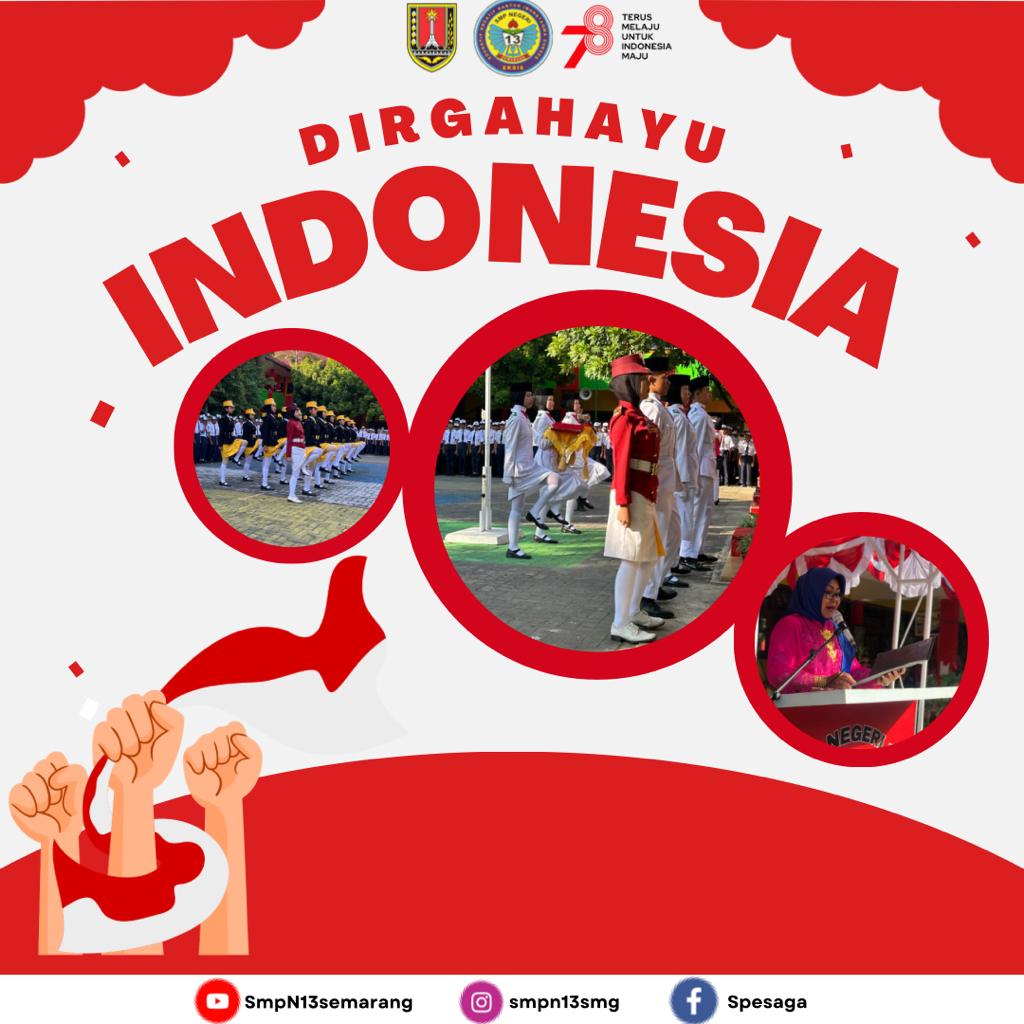 Tanggal 17 Agustus 2023 warga SMP Negeri 13 Semarang melaksanakan upacara bendera dalam rangka HUT Ke-78 RI. Pengibaran bendera dilakukan oleh paskibra SMP Negeri 13 Semarang dengan formasi yang sangat kompak dan memukau, sehingga membuat bendera merah putih dapat berkibar dengan gagah di tiang bendera.